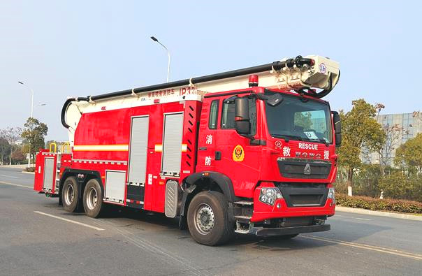 JP32米舉高噴射消防車是選用中國重汽T系列豪沃消防車底盤,原廠單排雙開門駕駛室,可載含駕駛員在內(nèi)的乘員2人,駕乘舒適輕便;集水罐車、泡沫車、高噴車三者功能與一身,具有高層滅火、火場監(jiān)控、快速作戰(zhàn)等國內(nèi)先進(jìn)水平的高性能多功能消防車。該車采用電液比例及下車集中控制技術(shù),是全液壓驅(qū)動(dòng)、伸縮加折疊臂式消防車;同時(shí)該車自帶7噸水罐及2噸泡沫罐,可在距離水源較遠(yuǎn)的位置完成消防作業(yè)。該車綜合應(yīng)用新技術(shù)、新工藝、新材料并結(jié)合自身技術(shù)優(yōu)勢,豐富高噴車的功能配置,提高了高噴車的單車作戰(zhàn)能力。