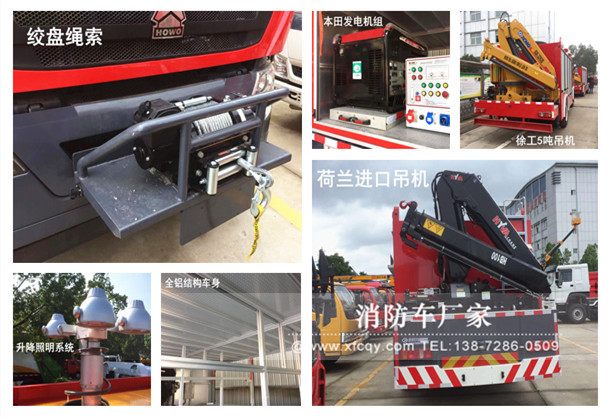 駕駛室頂部前端為長排警燈,車身后配有24V/60W火場照明燈一只,車輛兩側(cè)上方各配有紅藍(lán)相配的爆閃燈,下方安裝安全標(biāo)志燈,乘員室、器材箱、 泵房內(nèi)均裝有照明燈,加裝有100W警報(bào)器,回轉(zhuǎn)警燈開關(guān)、通訊設(shè)備預(yù)備接口。